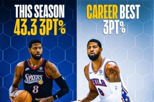 本賽季,喬治三分命中率43.3%,場(chǎng)均出手6次三分,可以命中2.6記。喬治生涯三分命中率38.4%。