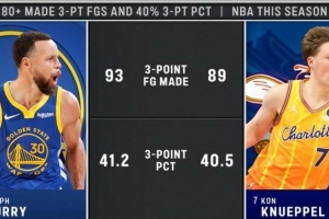 黃蜂主場(chǎng)迎戰(zhàn)老鷹,轉(zhuǎn)播方曬出新秀克尼佩爾的數(shù)據(jù),本賽季僅有兩位球員在命中率40%以上的情況下命中了80記三分球,分別是: