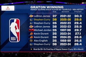 35+歲單賽季場(chǎng)均得分榜:詹姆斯30.3分最高 庫(kù)里三次進(jìn)前9