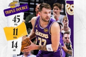 賽后湖人發(fā)布東契奇數(shù)據(jù)海報(bào),并寫道:“湖人生涯的首個(gè)40+三雙?!?/p>