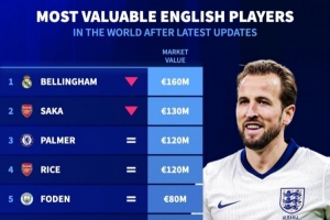 英格蘭球員最新身價(jià)榜:貝林壓薩卡居首,帕爾默、賴斯并列第三