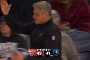 GIF-海蘭德切球亞歷山大被吹犯規(guī),森林狼挑戰(zhàn)成功,還拿到球權(quán)