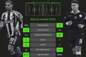 本賽季英超關(guān)鍵數(shù)據(jù)對(duì)比:吉馬良斯5球2助攻,恩佐4球1助攻