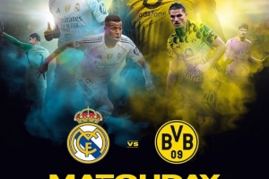 海報(bào)中多特球員吉拉西、薩比策以及科貝爾出鏡,而皇馬方面也有姆巴佩、貝林厄姆、庫爾圖瓦出鏡。