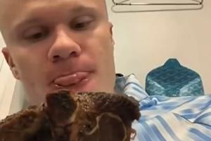 哈蘭德在社交媒體上曬出了一段視頻,視頻中,他坐在更衣室里,手拿著一塊帶骨牛排對(duì)著鏡頭一頓猛啃,邊吃還舔嘴,看得出他吃得很香。
