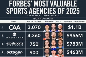 福布斯公布經(jīng)紀(jì)公司2025傭金排名!CAA11億刀第一 Klutch第五