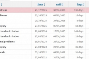 在2025/26賽季,遭遇感冒、小腿傷病和韌帶撕裂,預(yù)計缺席152天,預(yù)計錯過23場比賽。