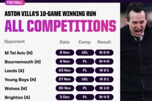 在球隊(duì)作為頂級(jí)聯(lián)賽俱樂(lè)部的111年時(shí)間里,維拉首次取得正式比賽10連勝。而且,這也是他們自1990年以來(lái),首次在頂級(jí)聯(lián)賽中取得7連勝。