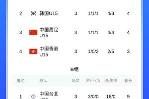 積分榜方面,U15中國隊(duì)與韓國U15同積4分,相互戰(zhàn)績一致,小組凈勝球落后對(duì)手1球,最終排名第三收官。