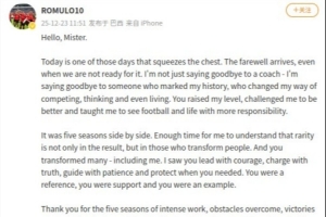 今天真的是讓我感到難過(guò),離別總是來(lái)得那么突然,讓人措手不及。我不僅僅是在向一位主教練告別,更是在向一位給我留下深刻印記的人告別,他改變了我的比賽方式、思維模式乃至日常生活。您提升了我的競(jìng)技水平,激勵(lì)我變得更好,并教會(huì)我?guī)е嘭?zé)任感看待足球和生活。