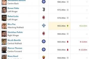 體育資訊12月23日訊 德轉(zhuǎn)今日更新意甲球員身價(jià),勞塔羅最高8500萬歐不變,帕斯?jié)q至6500萬歐。