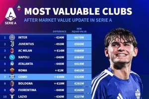 意甲球隊(duì)身價(jià)榜:國(guó)米6.7億歐居首,尤文、米蘭、那不勒斯前四