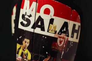 板上印有他在埃及國(guó)家隊(duì)穿10號(hào)球衣的圖案,以及利物浦主場(chǎng)通道里“這里是安菲爾德”的著名logo。