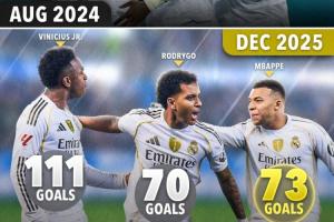2024年8月,姆巴佩收獲皇馬處子球時,羅德里戈已經(jīng)代表皇馬取得54粒進(jìn)球,維尼修斯已經(jīng)打進(jìn)84球。一個半賽季過后,姆巴佩已經(jīng)代表皇馬83場比賽打進(jìn)73球,超越了羅德里戈的70球,與111球的維尼修斯的距離也大幅縮小。