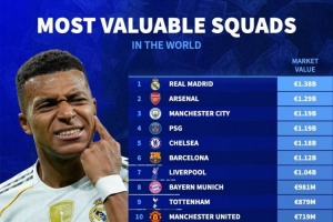體育資訊12月25日訊 德轉(zhuǎn)更新各聯(lián)賽球員身價(jià),并列出了俱樂(lè)部身價(jià)排名,皇馬13.8億歐居首,阿森納、曼城前三。
