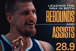 NBA官方配文:“NBA籃板王+助攻王,用‘歷史性’都無法形容約基奇本賽季的表現(xiàn)???!?/p>