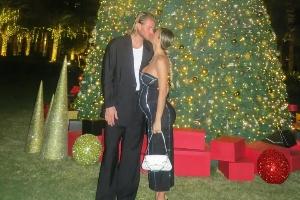 在圣誕樹下迪萊塔·萊奧塔與卡里烏斯甜蜜親吻,圖中可以看到迪萊塔·萊奧塔的小腹隆起明顯。本月卡里烏斯妻子宣布已懷上二胎,兩人將迎來第二個孩子。