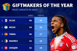體育資訊12月25日訊 德轉(zhuǎn)官方社媒列出2025年度足壇助攻榜,拜仁球員奧利塞以66場(chǎng)30次助攻居首,邁阿密國(guó)際球員梅西54場(chǎng)29次第二。