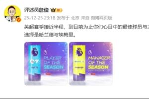 體育資訊12月25日訊 評(píng)述員詹俊社媒發(fā)文,談到了英超賽季半程的最佳球員與教練。