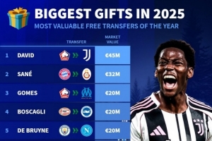體育資訊12月26日訊 德國轉(zhuǎn)會市場統(tǒng)計了2025年自由身轉(zhuǎn)會球員的身價,并列出榜單,戴維4500萬歐居首。