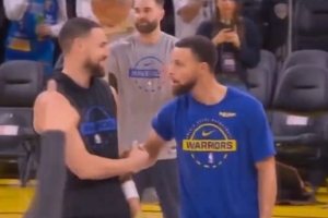 庫(kù)里:“他通常都在差不多的時(shí)間熱身,所以我知道他大概也會(huì)出來。我們?cè)诎雸?chǎng)有過一次短暫的互動(dòng)?!?/p>