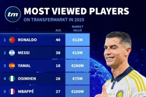 體育資訊12月26日訊 德國(guó)轉(zhuǎn)會(huì)市場(chǎng)統(tǒng)計(jì)了2025年球員信息頁(yè)面的瀏覽量,并列出排名,C羅、梅西、亞馬爾前三。