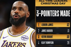隨著今天比賽中詹姆斯投進(jìn)一記三分,他生涯圣誕大戰(zhàn)三分命中數(shù)達(dá)到32記,超越哈登(31記),獨占圣誕大戰(zhàn)歷史三分王。而杜蘭特今天命中4記三分,升到了第三位。賈馬爾·穆雷(今天命中9記)和霍福德的排名也有變化。而前十中,除了雷迪克,其余均為現(xiàn)役球員。