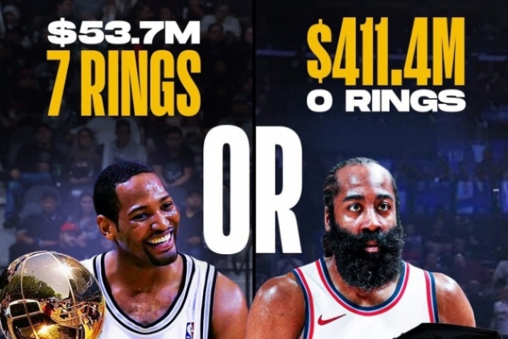 詹姆斯-哈登的(薪資)收入已經(jīng)超過(guò)了4.11億美元,但NBA生涯至今冠軍數(shù)仍是0。