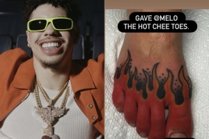這個紋身是紋在腳背、腳趾背部相連處,然后是一個火焰圖案。紋身師還配文:"給拉梅洛做了個‘火辣芝士腳趾’紋身。"