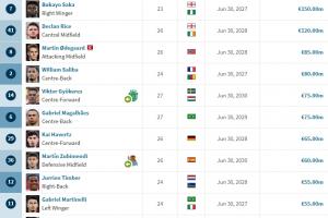 阿森納隊(duì)內(nèi)身價(jià)排名(單位:歐元/數(shù)據(jù)來源德轉(zhuǎn)):