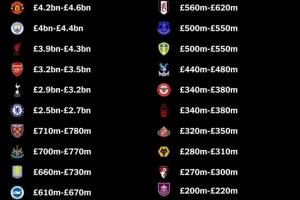 體育資訊12月27日訊 著名媒體《The Athletic》仔細(xì)研究了行業(yè)估算,查看了俱樂(lè)部最近的財(cái)務(wù)狀況,并匯總了相關(guān)數(shù)據(jù)。包括TA在內(nèi),加上Football Benchmark、福布斯、Kinnaird和Sportico的估計(jì)數(shù)值匯總,他們給出了英超20隊(duì)的價(jià)值區(qū)間。