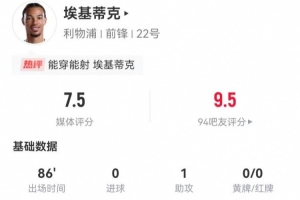 ?;倏吮緢?射0正1中框 1助攻+1關(guān)鍵傳球 8對抗5成功 獲評7.5分