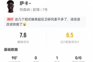 薩卡本場6射2正 1助攻+4關鍵傳球 5過人3成功+6傳中2成功 獲7.6分