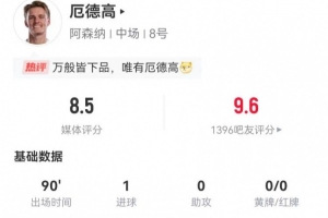 厄德高本場1球+5關鍵傳球 3搶斷+5對抗4成功 獲評8.5分全場最高