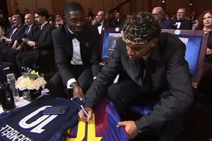 兩人在今年分獲金球獎(jiǎng)前二,他們也在頒獎(jiǎng)期間相互贈(zèng)送了簽名球衣,不遠(yuǎn)處則是拉波爾塔、維蒂尼亞、伊涅斯塔等兩隊(duì)的知名人士。