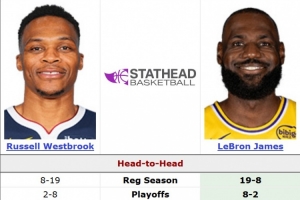 生涯至今,威少常規(guī)賽面對詹姆斯為8勝19負(fù),季后賽為2勝8負(fù)。