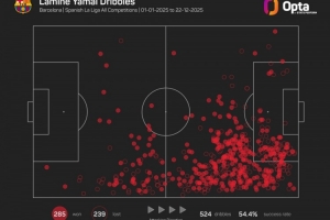 18歲的巴薩右邊鋒亞馬爾在今年各項賽事共計524次嘗試過人,285次成功過人是為五大聯(lián)賽球員同期最多。