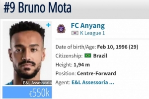 現(xiàn)年29歲的巴西前鋒莫塔,2025年初加盟K聯(lián)賽安養(yǎng),2025賽季共出戰(zhàn)37場,貢獻14個進球和3次助攻。