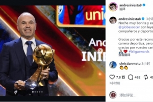 獲得生涯貢獻獎!伊涅斯塔社媒:感謝對我職業(yè)生涯的認可