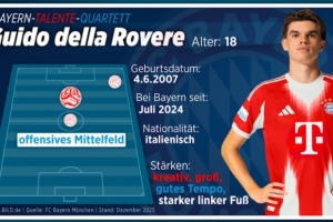 圭多·德拉羅韋雷,這位18歲的攻擊型中場身材高大卻技術(shù)細膩,被譽為“擁有細膩的左腳技術(shù)”。作為拜仁U23主力,他在地區(qū)聯(lián)賽中交出了4球9助攻的數(shù)據(jù),身價在一年半內(nèi)增長了六倍。