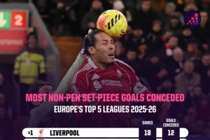 體育資訊12月30日訊 Opta統(tǒng)計了本賽季五大聯(lián)賽球隊定位球的失球數(shù)量(不包括點球),并列出榜單,利物浦12球居首,這也是2015-2016賽季(15球)之后,利物浦定位球失球最多的賽季。
