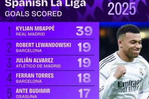 體育資訊12月30日訊 2025年接近尾聲,squawka也統(tǒng)計了本年度西甲進球情況,姆巴佩獨自斷崖領跑。