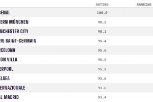 Opta俱樂部競(jìng)技實(shí)力年終排名: