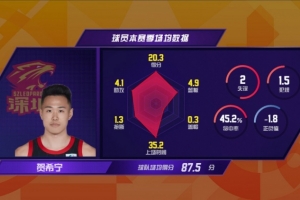 8輪戰(zhàn)罷,賀希寧的場(chǎng)均出場(chǎng)35.3分鐘,排在CBA聯(lián)賽所有球員的第一位。賀希寧本賽季場(chǎng)均得到20.3分4.9次籃板4.1次助攻,這是他加入聯(lián)賽11個(gè)賽季以來(lái),場(chǎng)均得分首次超過(guò)20分,這一數(shù)據(jù)暫列本土球員第二位。除了得分這一項(xiàng),賀希寧在籃板球和助攻方面表現(xiàn)同樣出色,4.9個(gè)籃板球和4.1次助攻均在其過(guò)往的生涯數(shù)據(jù)中排在前列。僅就前8輪的表現(xiàn),賀希寧稱(chēng)得上本賽季表現(xiàn)最為均衡的后衛(wèi)之一,他是本賽季唯一一位場(chǎng)均得到20分4籃板4助攻的本土球員。
