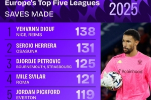 2025年五大聯(lián)賽撲救榜:尼斯門將葉赫萬·迪烏夫138次居首