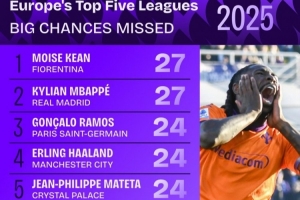 2025年五大聯(lián)賽錯失重大機會次數(shù)榜: