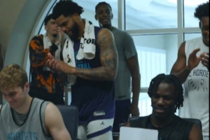 三球、格威、邁爾斯-布里奇斯、布蘭登-米勒以及剛加盟的塞克斯頓在一旁鼓掌表示歡迎。