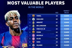 體育資訊1月1日訊 2025年已經(jīng)結(jié)束,《轉(zhuǎn)會(huì)市場(chǎng)》也列出了當(dāng)前全球身價(jià)榜前二十的球員,亞馬爾、哈蘭德和姆巴佩均2億歐最高。