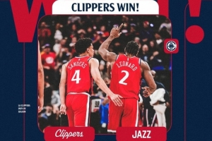 賽后快船發(fā)布本場(chǎng)比賽贏球海報(bào),萊昂納德單手指天!