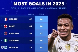 體育資訊1月2日訊 2025年已經(jīng)過去,《轉(zhuǎn)會市場》也統(tǒng)計(jì)了2025前15聯(lián)賽球員的俱樂部+國家隊(duì)各項(xiàng)賽事總進(jìn)球情況,皇馬前鋒姆巴佩領(lǐng)跑。